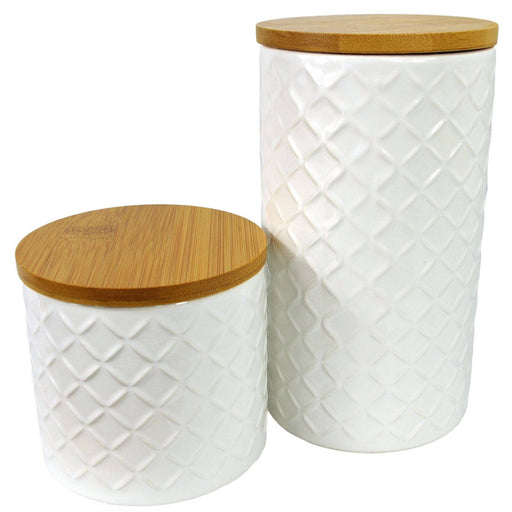 Keep your kitchen stylish and organised with this set of two Leaf Design ceramic canisters with bamboo lids. Designed for everyday use, these durab...