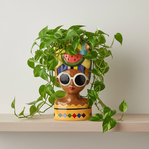 View full detailsMelon and Blue Bird Hat Lady Pot with Oversized Sunglasses